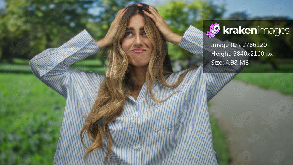 Woman with long blonde hair wearing striped shirt raises both hands beside head in sunlit park walkway; confusion frustration.