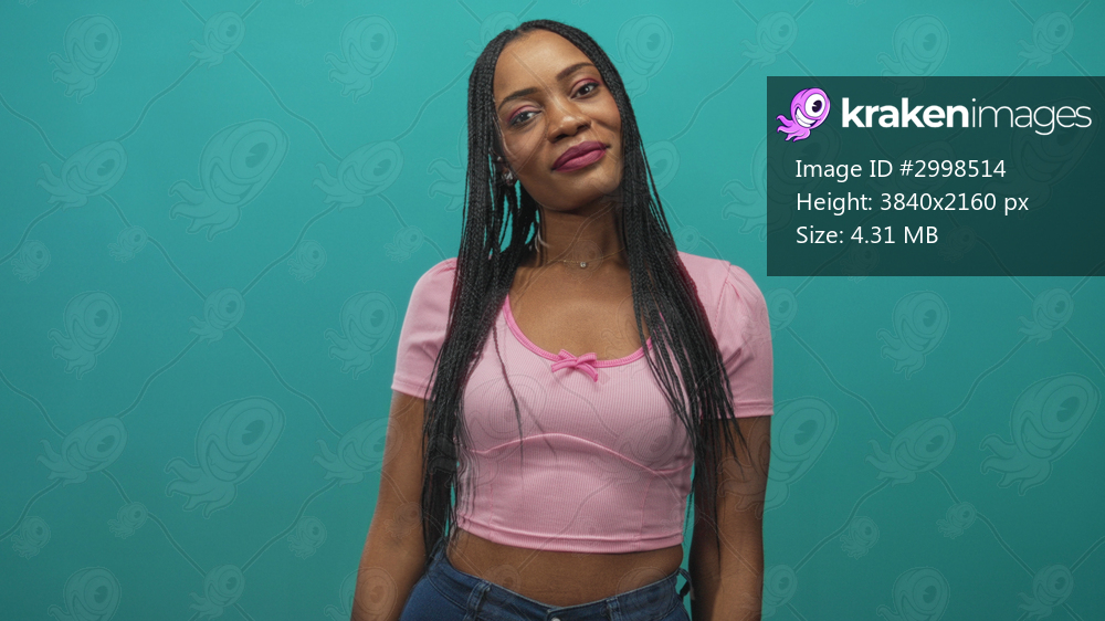 Woman with long braided hair smiles and shows bare midriff while tilting head, studio portrait; playful confidence.