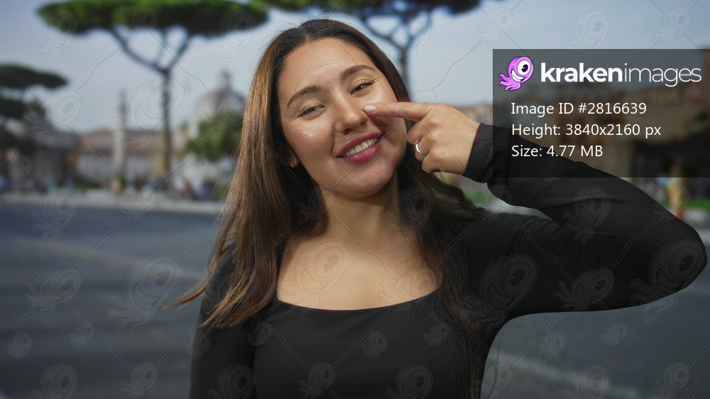 Woman with long brown hair and black top smiling while pointing finger to cheek on street; happiness.