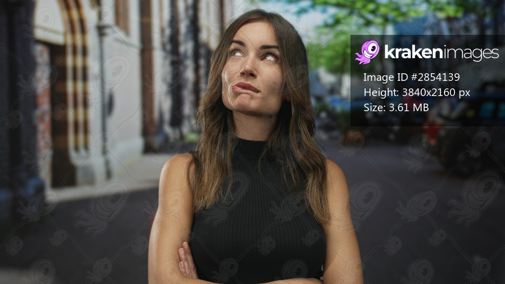 Woman with long brown hair crosses arms and purses lips on street lined with parked cars; rebellion defiance.