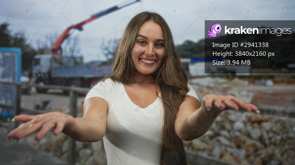 Woman with long brown hair smiling with arms extended revealing chest in white tshirt at building construction outdoors; warmth joy.