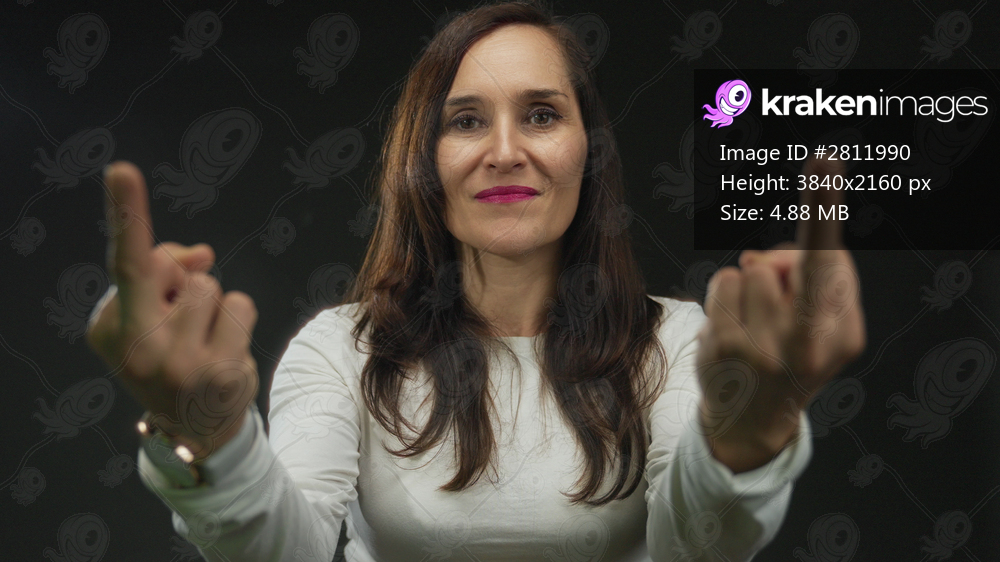 Woman with long brown hair wearing a white shirt makes an obscene gesture against a black background showing defiance and attitude
