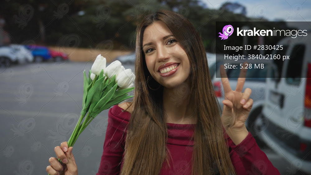 Woman with long brown hair wearing off shoulder top shows victory hand sign beside white cars in outdoor parking lot; celebration joy.