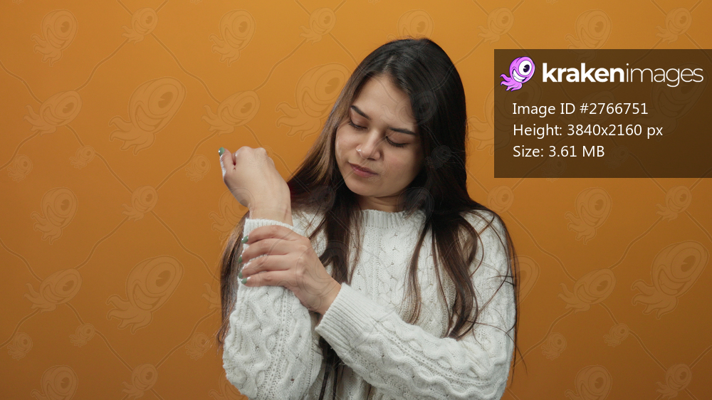 Woman with long brown hair wearing white sweater stands against isolated orange background checking wrist with a focused expression, showcasing casual autumn fashion. - Kraken Images