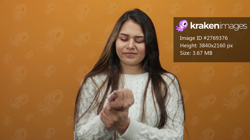 Woman with long brown hair wearing white sweater stands against isolated orange background checking wrist with a focused expression, showcasing casual autumn fashion. - Kraken Images