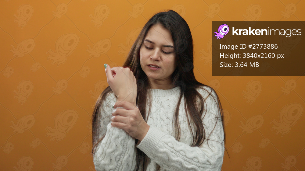 Woman with long brown hair wearing white sweater stands against isolated orange background checking wrist with a focused expression, showcasing casual autumn fashion. - Kraken Images
