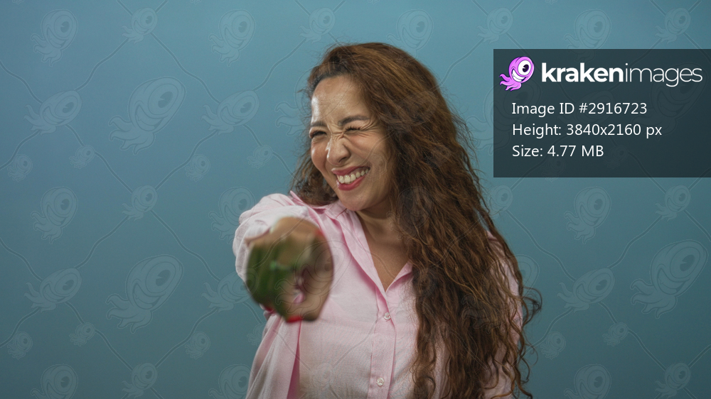 Woman with long curly hair in pink shirt pointing finger to camera in studio against blue backdrop while smiling and winking; playful confident energy. - Kraken Images