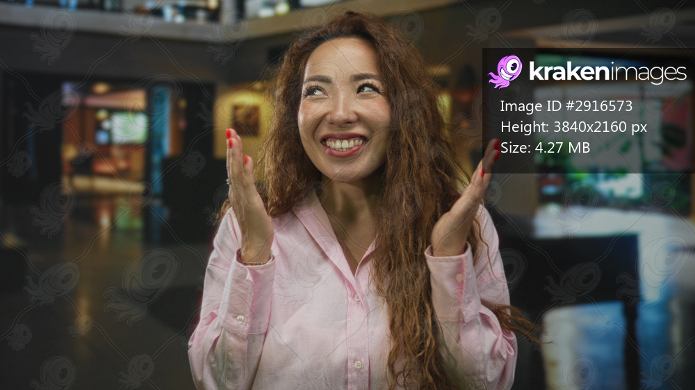 Woman with long curly hair smiling with palms up and wearing a pink shirt in hotel lobby building; welcoming warmth.