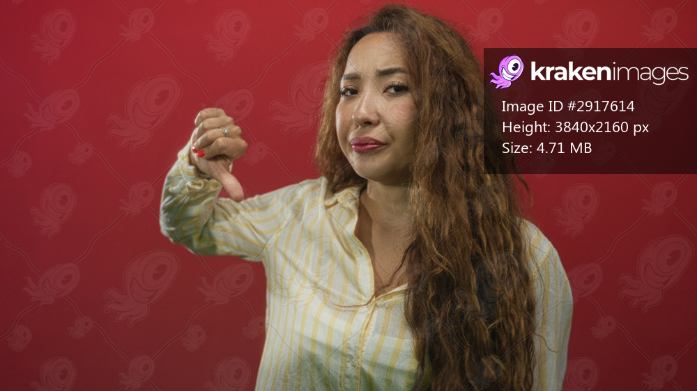 Woman with long curly hair and striped shirt points finger up and gives thumbs down in studio against red wall; disapproval critique decision.