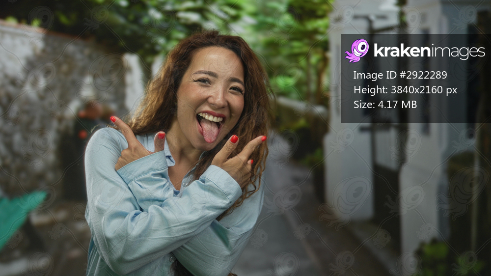 Woman with long curly hair wearing light blue shirt showing rock horns with fingers and smiling on a narrow street; playful confidence.