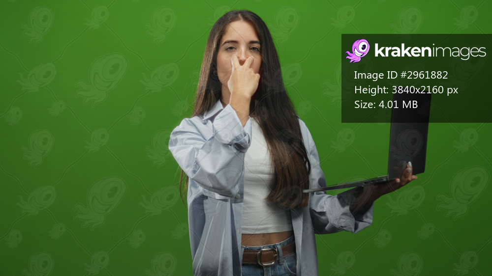 Woman with long dark hair holding laptop and pointing finger toward camera in studio green backdrop, wearing white crop top and open shirt; confidence empowerment. - Kraken Images