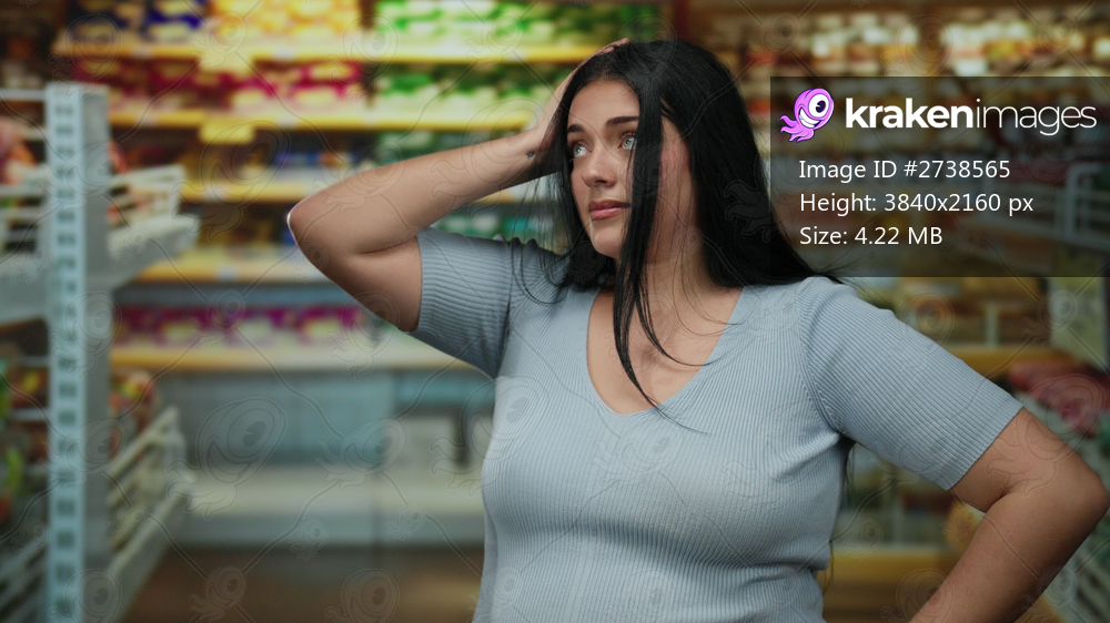 Woman with long dark hair in blue shirt stands in supermarket aisle looking concerned with hands on head amidst colorful shelves.