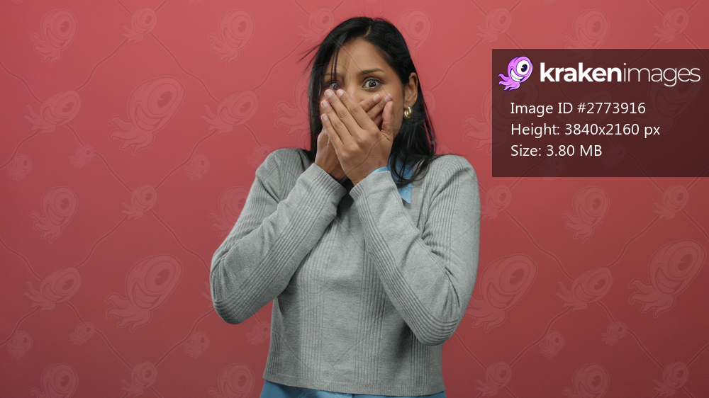 Woman with long dark hair in gray sweater covers mouth in surprise against red wall background illustrating shock emotion and isolated atmosphere.