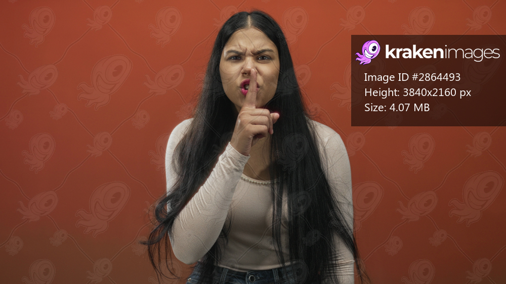 Woman with long dark hair making finger to lips for silence in orange studio wearing white shirt and jeans; silence.