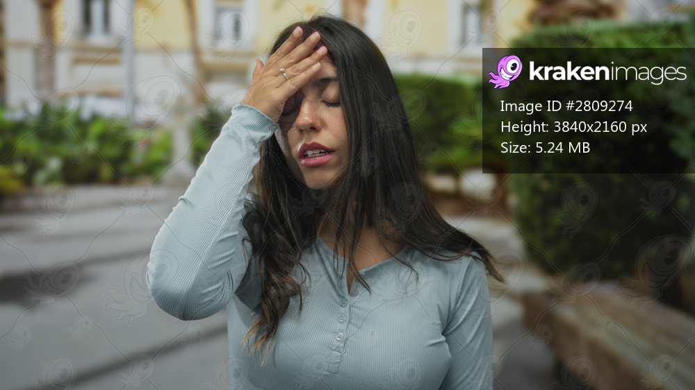 Woman with long dark hair outdoors in urban area, expressing frustration with hand on forehead, wearing casual shirt on a sunny day surrounded by greenery and buildings. - Kraken Images
