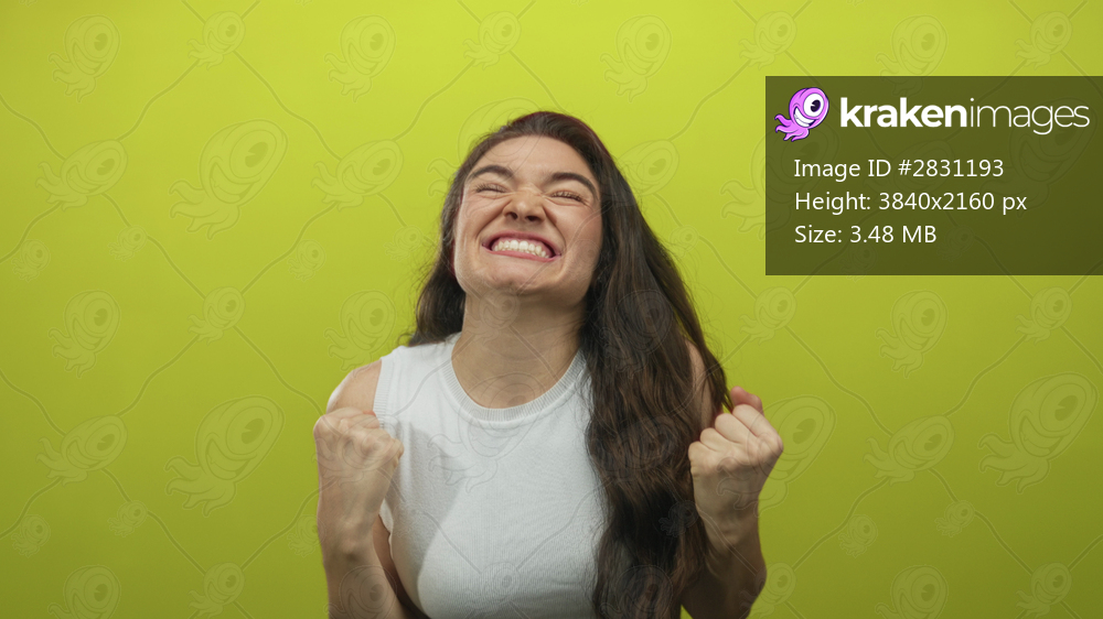 Woman with long dark hair, wide grin and clenched fists against a bright green studio wall; excitement.