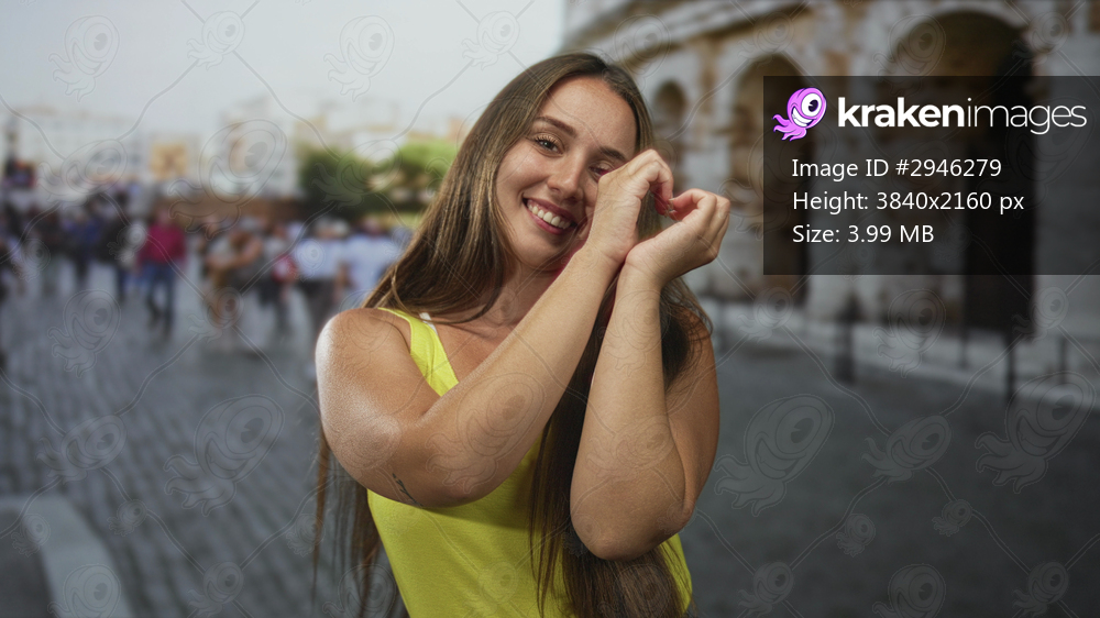 Woman with long hair forming a heart with her hands at the coliseum building, smiling and showing bare shoulders in a yellow tank top; travel joy.