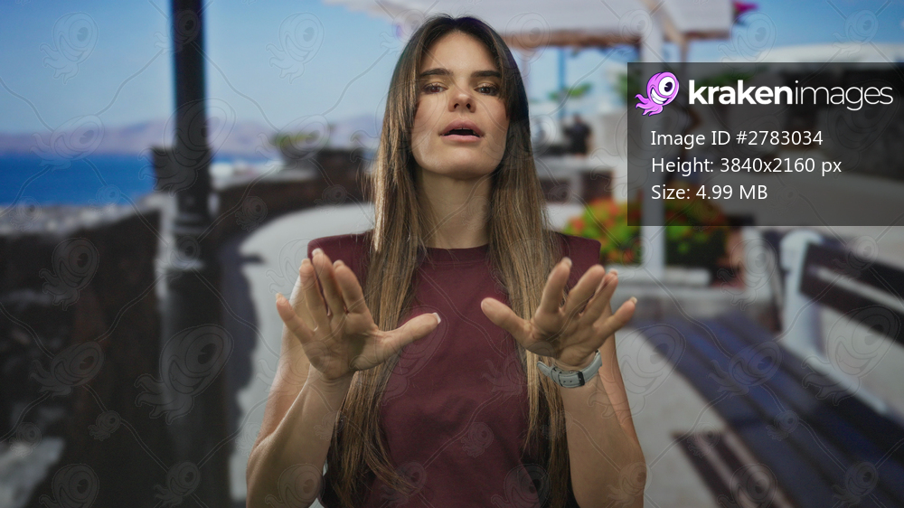 Woman with long hair gestures calmly with hands on a sunny beachside promenade with benches and vibrant flowers in the background on a clear outdoor day. - Kraken Images