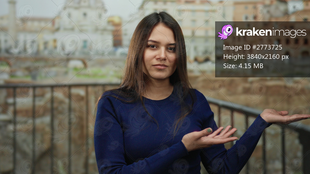 Woman with long hair gestures outdoors in front of ancient roman ruins, embodying exploration and history in a captivating street scene.