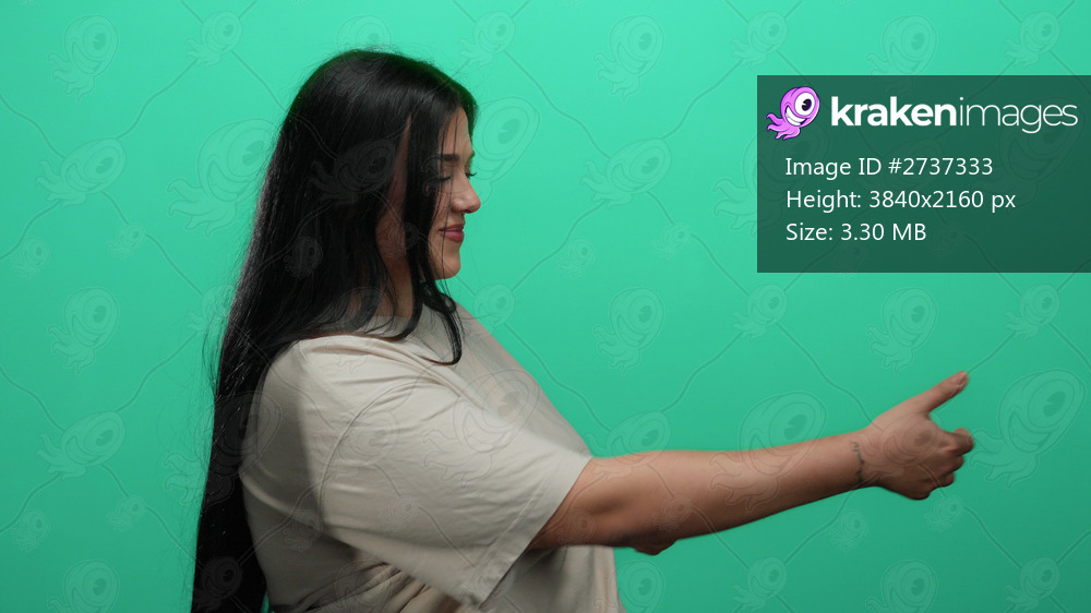Woman with long hair gestures playfully pulling an imaginary rope against a vibrant green background, depicting youthful energy and creativity in an isolated studio setting. - Kraken Images