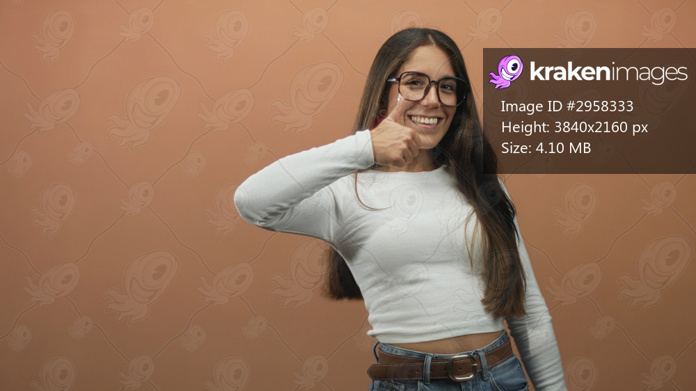 Woman with long hair and glasses gives two thumbs up showing visible hands and broad smile, wearing white shirt, jeans and belt in studio wall; confidence celebration. - Kraken Images