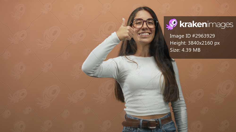 Woman with long hair and glasses gives two thumbs up showing visible hands and broad smile, wearing white shirt, jeans and belt in studio wall; confidence celebration. - Kraken Images