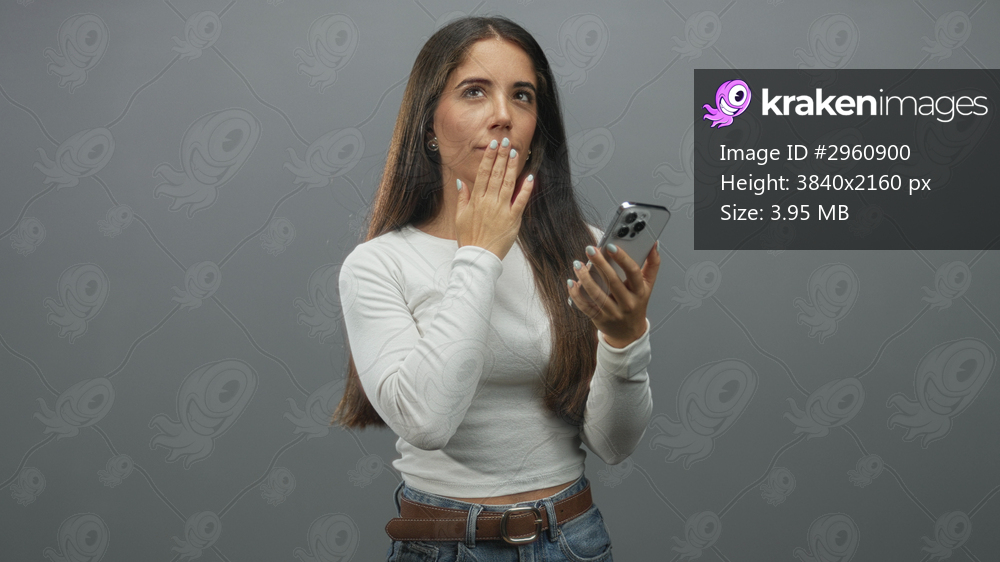 Woman with long hair holding smartphone, hand to mouth gesture and smiling while looking at screen in studio; delight connection.