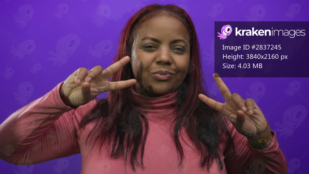 Woman with long hair holding up both hands showing peace sign wearing pink turtleneck in studio; optimism.