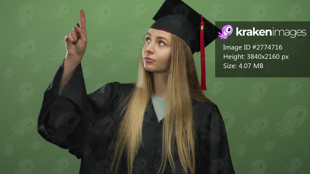 Woman with long hair in graduation gown showing thumbs up against an isolated green wall background.