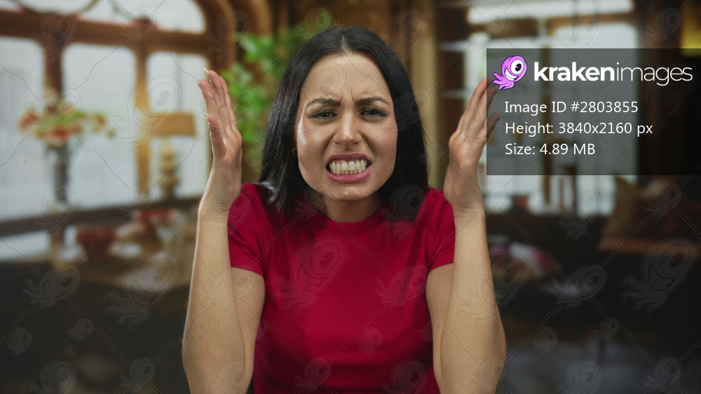 Woman with long hair in red shirt gesturing indoors, expressing frustration in a cozy home setting with wooden decor and natural light streaming through windows. - Kraken Images