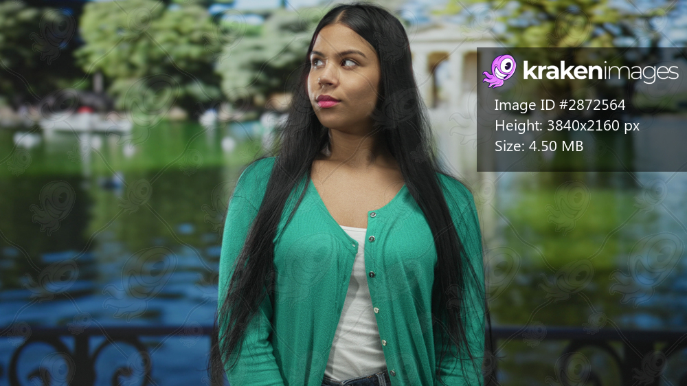 Woman with long hair looks sideways by building facing pond railing under trees; quiet contemplation.