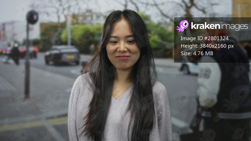 Woman with long hair making facial expressions on a street with blurred cars and greenery, showcasing diverse reactions in an urban outdoor setting.