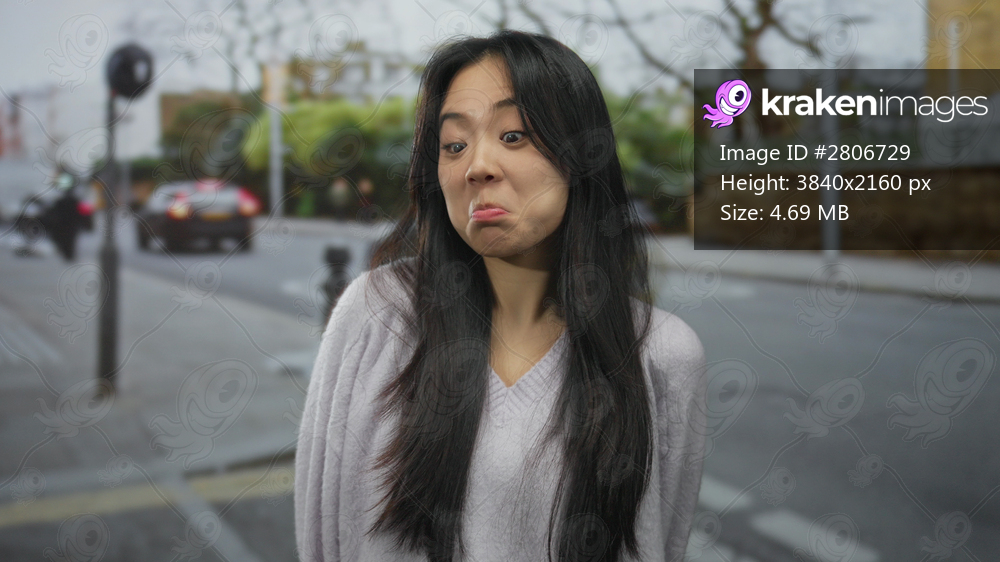 Woman with long hair making facial expressions on a street with blurred cars and greenery, showcasing diverse reactions in an urban outdoor setting.
