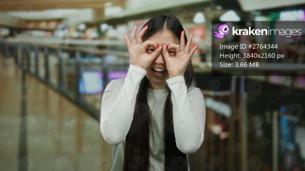 Woman with long hair making glasses gesture with hands inside bright mall wearing white shirt surrounded by bustling atmosphere and vibrant stores