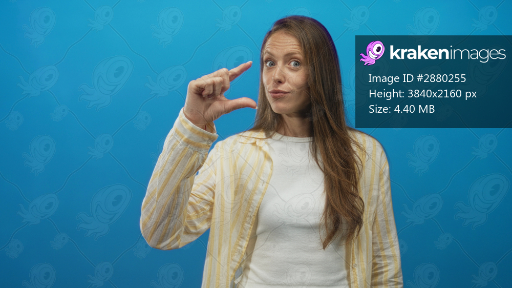 Woman with long hair pinching her fingers to show small size in a bright blue studio wearing a white tee and yellow striped shirt; playful skepticism.