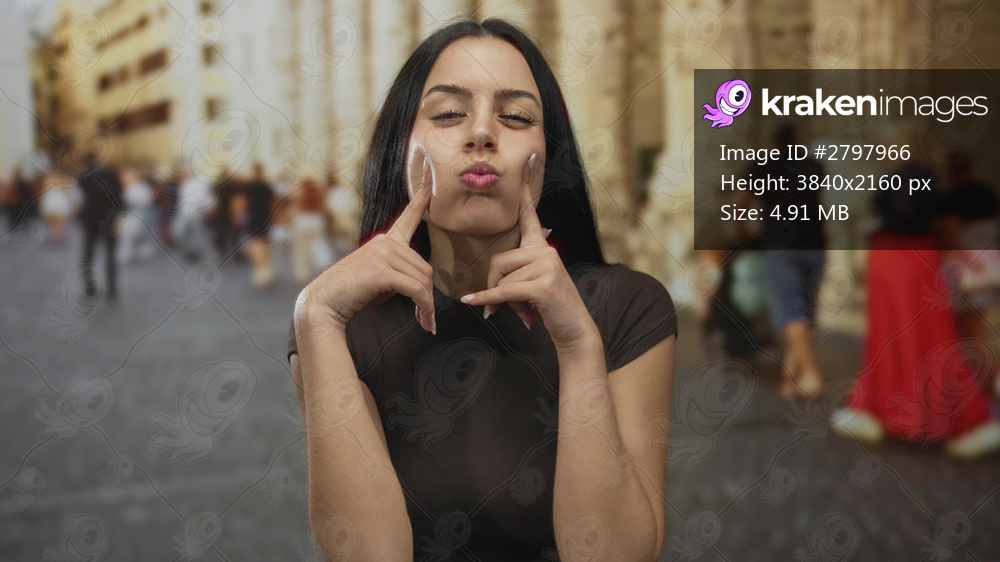 Woman with long hair playfully puffing cheeks on an old town street with a historic backdrop, capturing a lighthearted moment in an outdoor european setting. - Kraken Images