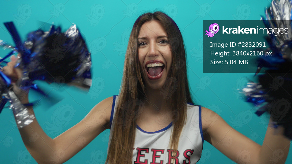 Woman with long hair raises blue and silver pompom with outstretched arms in turquoise studio; excitement.