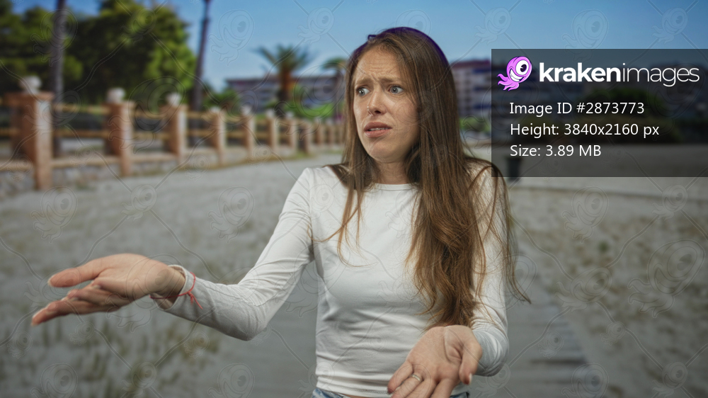 Woman with long hair raises both hands in a shrug gesture on a street promenade with sandy boardwalk and buildings behind her; confusion uncertainty.