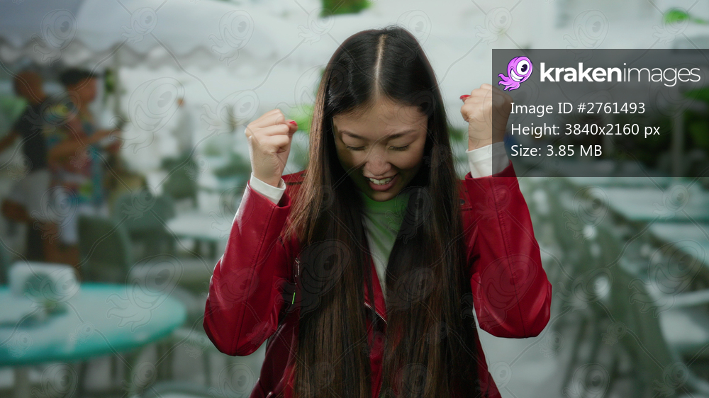 Woman with long hair and red jacket smiling joyfully on a terrace in an urban outdoor setting, embodying happiness and style amidst a lively restaurant environment. - Kraken Images