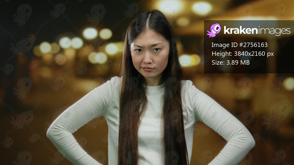Woman with long hair showing disapproval gesture outdoors on city street at night.
