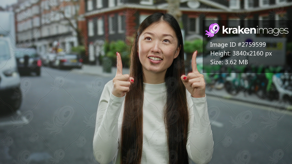 Woman with long hair smiling and pointing upwards on an urban street with cars and bicycles in the background, wearing a white shirt on an outdoor day. - Kraken Images