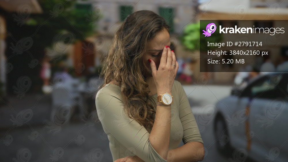 Woman with long hair standing on an urban street outdoors covers face with hand, wearing a watch, looks concerned, with blurred buildings and car in the background. - Kraken Images