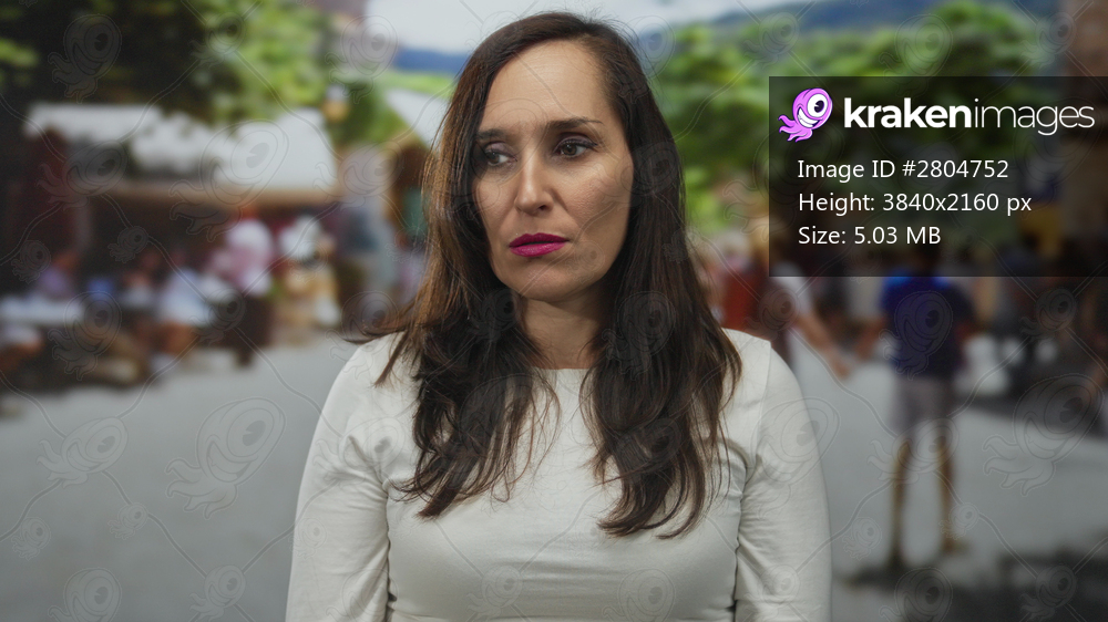 Woman with long hair standing outdoors on a busy city street, surrounded by people and vibrant urban life, expressing thoughtful emotion in a lively environment. - Kraken Images