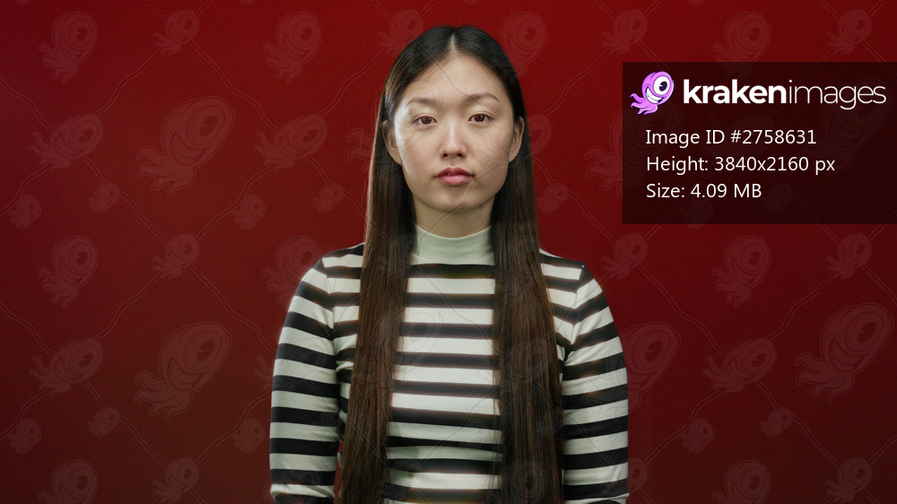 Woman with long hair and striped shirt stands against a vivid red background showcasing confidence and beauty with a contemporary fashion style.
