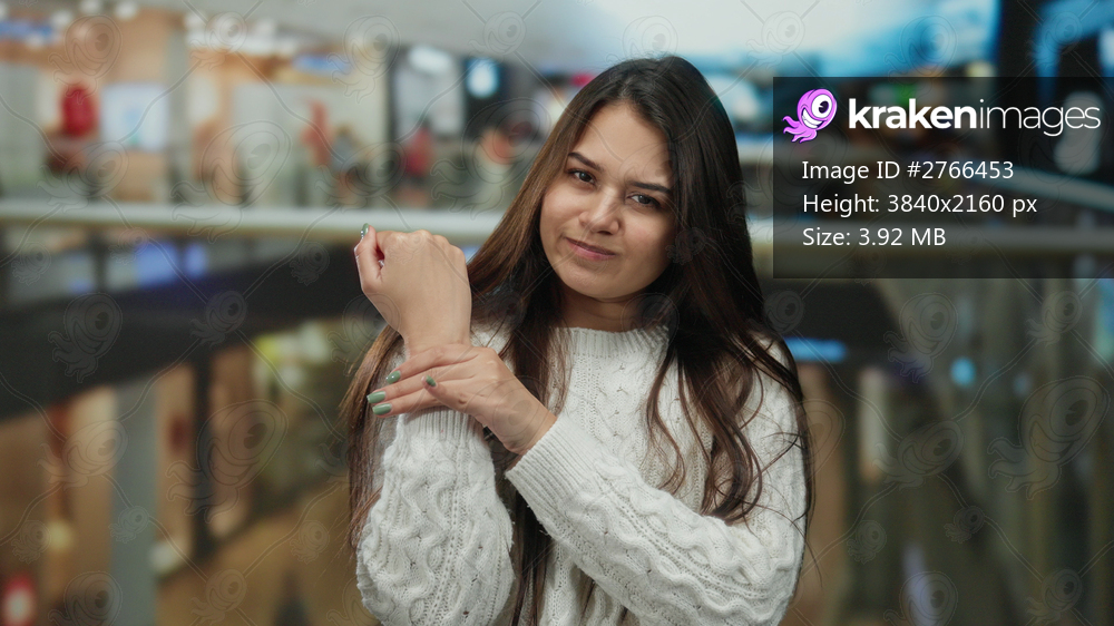 Woman with long hair wearing a sweater holds her wrist in discomfort while standing inside a busy mall