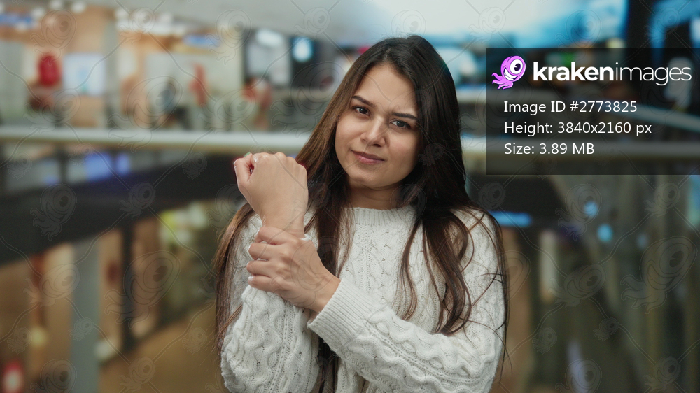 Woman with long hair wearing a sweater holds her wrist in discomfort while standing inside a busy mall