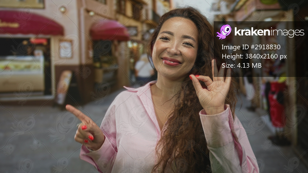Woman with long hair wearing pink shirt and red nails smiles, points finger and makes ok sign with hands in a narrow city street market; confidence.