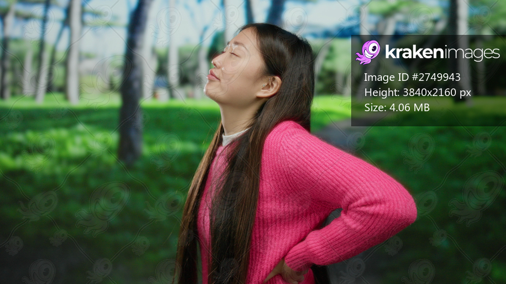 Woman with long hair wearing pink sweater stands in a lush green park with trees in the background, expressing discomfort and holding her back, under a bright outdoor setting. - Kraken Images