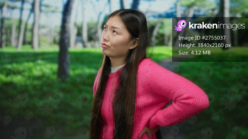 Woman with long hair wearing pink sweater stands in a lush green park with trees in the background, expressing discomfort and holding her back, under a bright outdoor setting. - Kraken Images