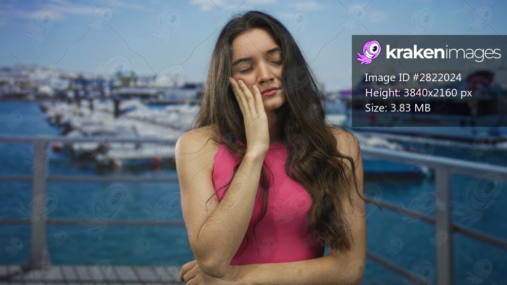 Woman with long hair wearing pink top with hand on cheek beside boat near building facade; drowsiness.